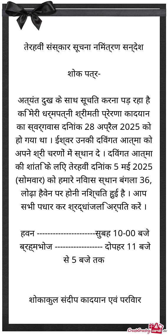 तेरहवीं संस्कार सूचना निमंत्रण सन्देश