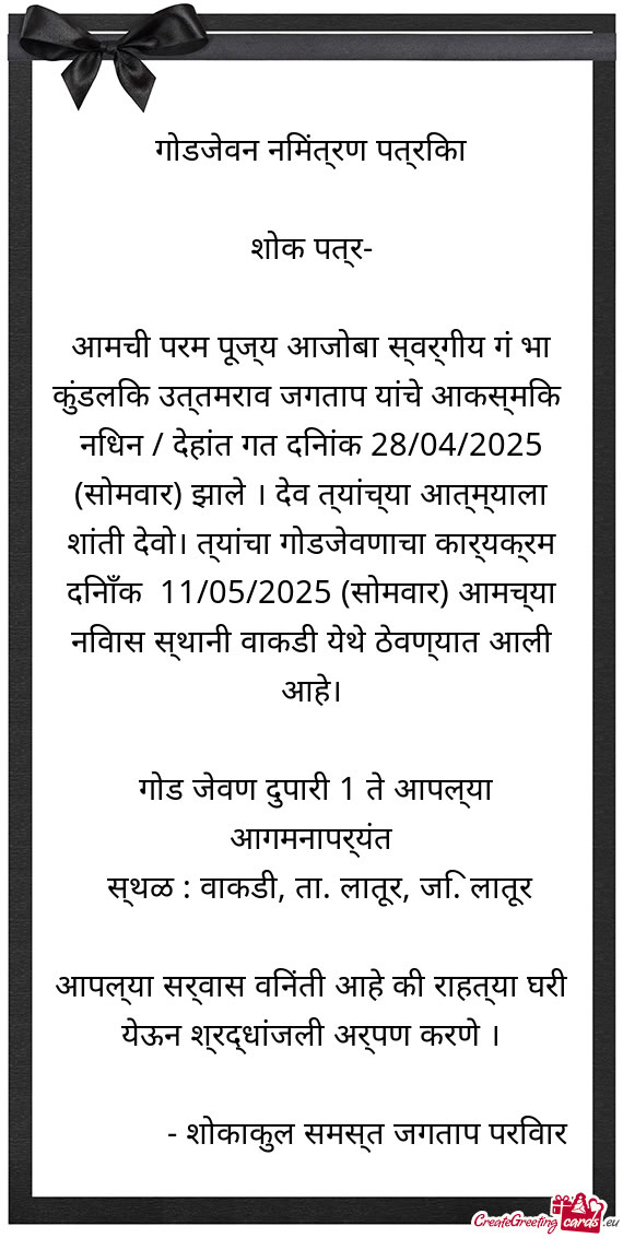 आपल्या सर्वास विनंती आहे की राहत्या घरी येऊन श्रद्धांजली अर्पण करणे ।