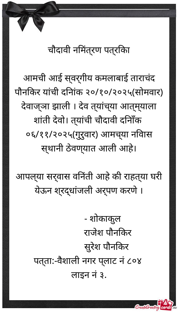 सत्रहवीं संस्कार सूचना निमंत्रण सन्द