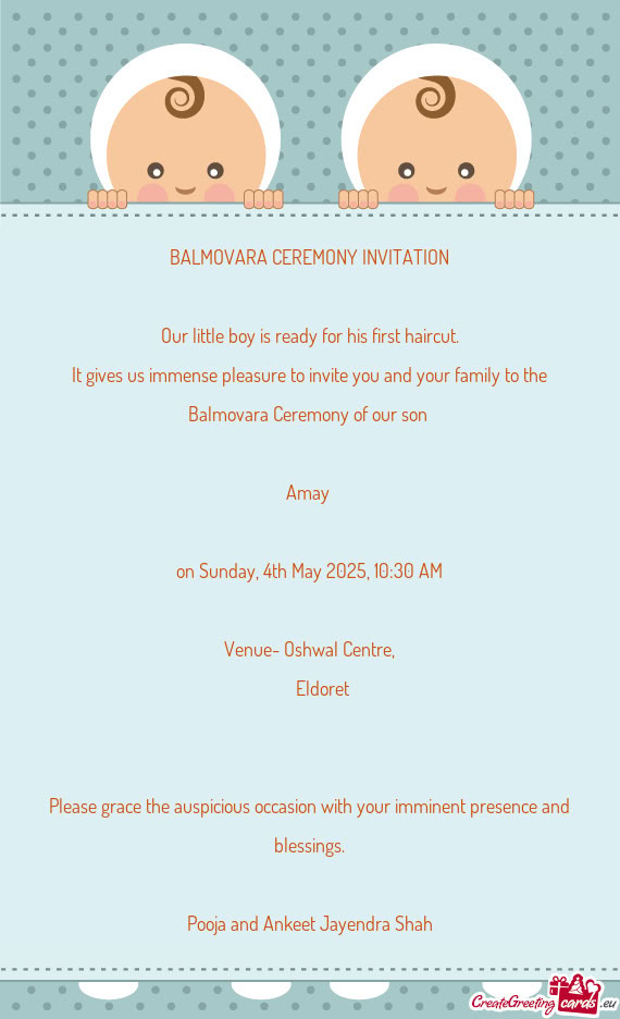 Please treat this as my personal invitation and kindly grace this occasion with your presence and blessing.
