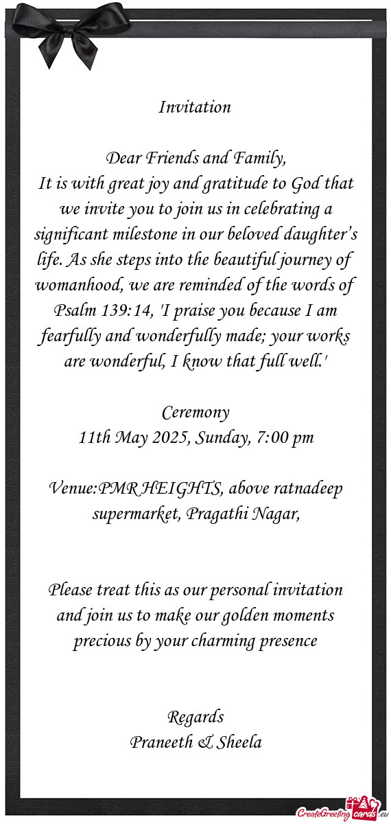 It is with great joy and gratitude to God that we invite you to join us in celebrating a significant milestone in our beloved daughter’s life. As she steps into the beautiful journey of womanhood, we are reminded of the words of Psalm 139:14, "I praise you because I am fearfully and wonderfully made; your works are wonderful, I know that full well."