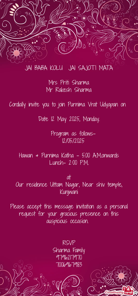 Please accept this message invitation as a personal request for your gracious presence at the Thaal prasadi programme.