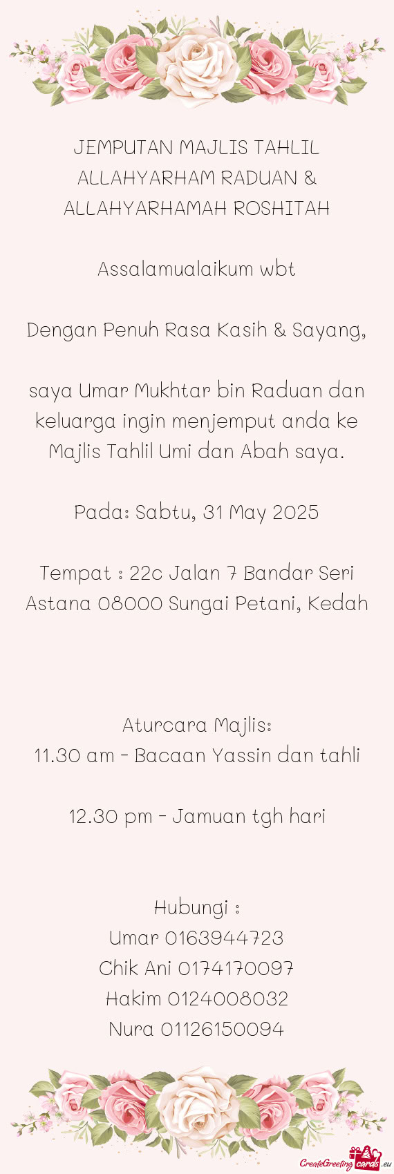 Semoga kehadiran tuan/puan akan mengimarahkan lagi majlis kami.