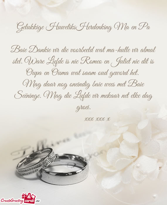 Baie Dankie vir die voorbeeld wat ma-hulle vir almal stel. Ware Liefde is nie Romeo en Juliet nie dit is Oupa en Ouma wat saam oud geword het.
